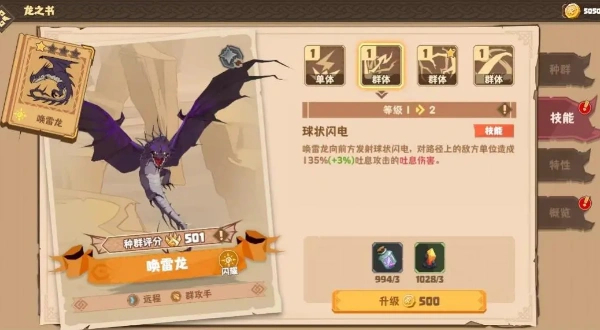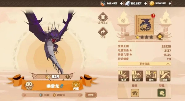 驯龙高手旅程唤雷龙是生命上限比较一般,定位是远程群攻型,可以在战斗中打出高额的伤害,玩家可以选择有护盾或者减伤技能的龙和他进行搭配,提升他的生存能力。