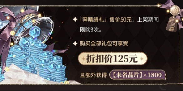 未定事件簿霁晴绮礼礼包在十一月份上线,该礼包是商城直售,价格为50元,购买后还能获得得未名晶片500片作为额外奖励,活动期间每个玩家最多只能购买三次,玩家可以直接叠加购买。