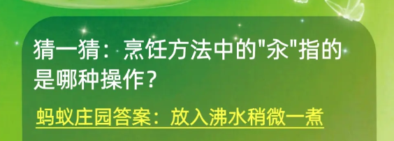 蚂蚁庄园11月13日问题是猜一猜烹饪方法中的汆指的是哪种操作,这道题选择放入沸水稍微一煮,汆别名汆烫、川烫,广义上是把食物放入沸水中煮,然后捞出。
