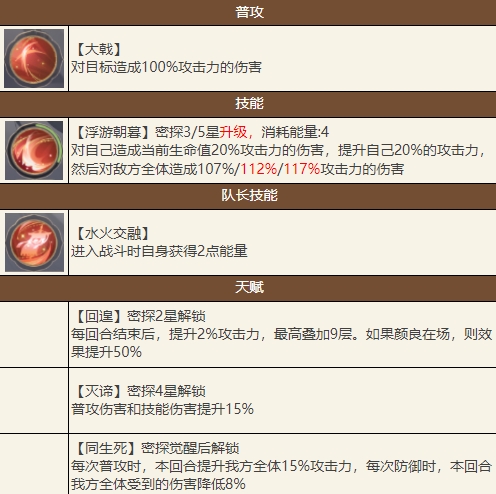 对敌方全体可以造成107%/112%/117%的攻击力的伤害,消耗4点能量值。