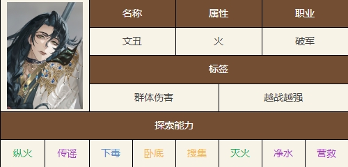 如鸢文丑是火属性的破军角色,可以对敌人造成较高的群体伤害,技能还可以提升自己的战斗输出特定,有着群体伤害和越战越强这两个特点,是一个比较值得培养的紫卡密探。