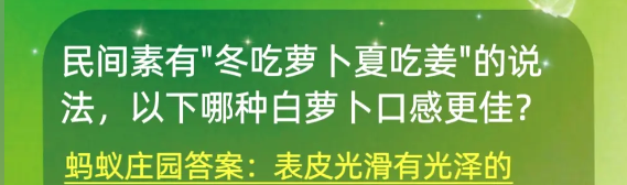 蚂蚁庄园11月14日问题是民间素有冬吃萝卜夏吃酱的说法,以下哪种白萝卜口感更佳,正确答案是表皮光滑有光泽的,冬吃萝卜夏吃姜这句话主要强调了白萝卜的食用价值,具有丰富的营养物质。