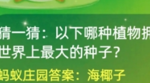 蚂蚁庄园8月19日的问题是猜一猜,以下哪种植物拥有目前世界上最大的种子,本题答案是海椰子,因为海椰子的开花结果周期十分的长,所以长出来的果实也十分大。