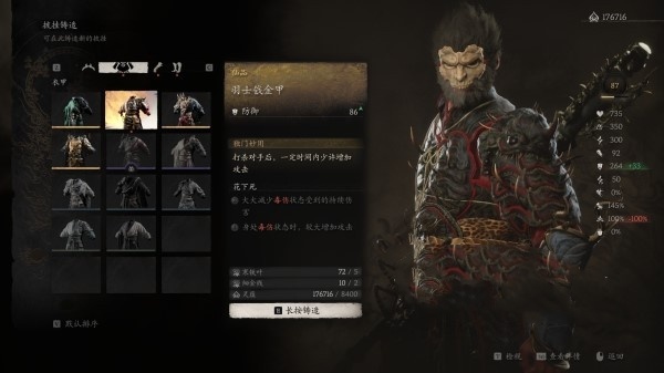 黑神话悟空羽士戗金甲是一个具有43防御力的上品衣甲,在战斗中可以让角色的攻击力大幅增加,获取的方式也比较简单,干掉BOSS百眼魔君之后铸造就行了。