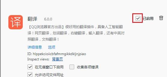 3、只需选中"翻译"功能,即可启用此扩展。