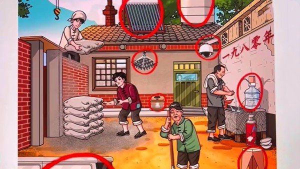 1、墙上的标语写着1980年,只要找出不符合这个时代的物品即可。