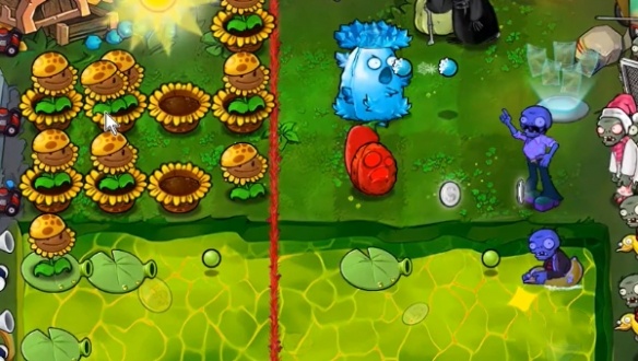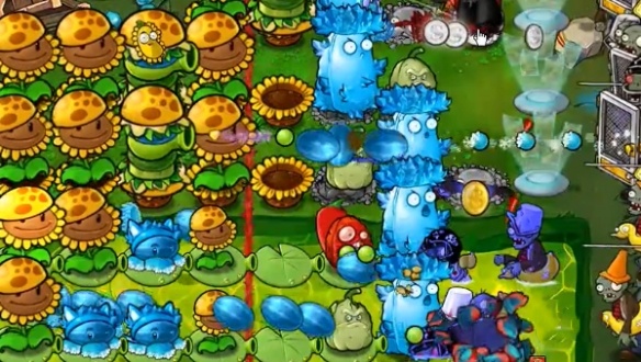 3、左边继续种植阳光向日葵,水里面种植豌豆荷叶后在上面放置寒冰西瓜猫蒲。