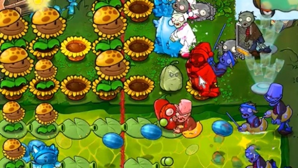 2、红线右边种植寒冰豌豆坚果和坚果炸弹来守卫后方的向日葵。