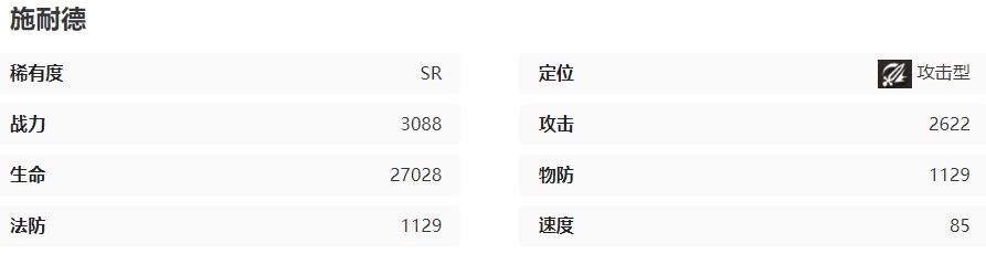 施耐德是一位稀有度为SR的攻击型角色,稀有度不算特别高,较易获得。
