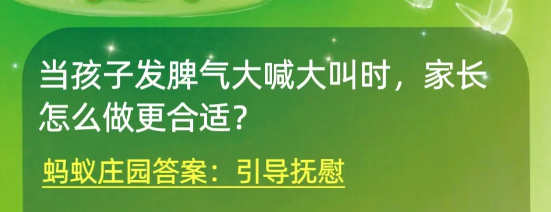 蚂蚁庄园11月20日问题是当孩子发脾气大喊大叫时家长怎么做更合适,正确选项为引导抚慰,当孩子的情绪大爆发时,家长应当进行接纳和理解,进行引导抚慰。