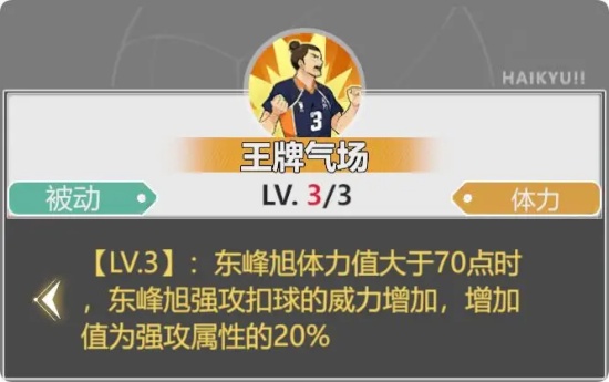 排球少年新的征程东峰旭在SSR级别中属于中上水平,主要依靠的就是他的大招威力很大,同时野会消耗很大的体力,这也导致他需要搭配增益使用才能正常的输出。