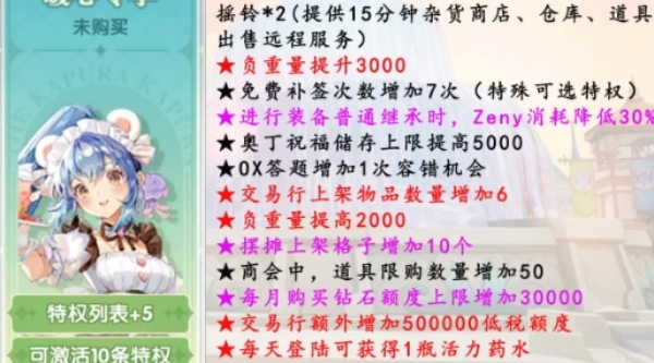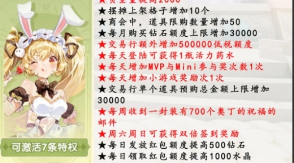 仙境传说新启航月卡一共有30,68等几个档位,本次就说说最低档位30元的月卡,激活之后可以每天额外领取活力药水,以及八次签到双倍和三十次小游戏的次数。