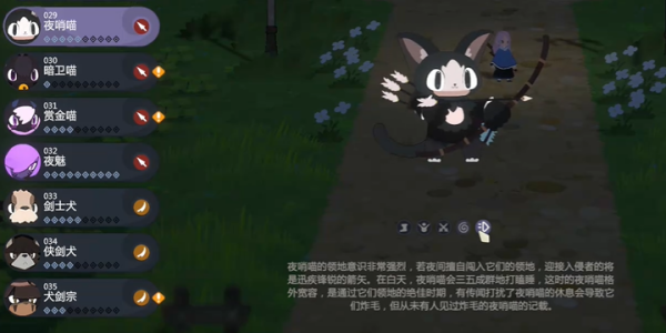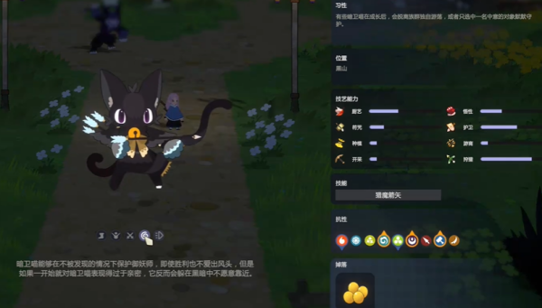 妖之乡暗卫猫是由其他妖精进化得到的,他常处于黑暗中一开始如果跟他太过亲密的话他会躲在黑暗中不靠近,所以玩家要注意跟他的亲密度,他可以在暗处保护玩家。