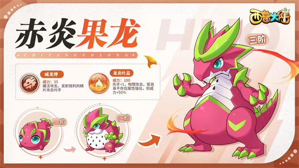 西普大陆手游赤炎果龙一阶时的样子就是一个可爱的火龙果,他是从长夏群岛渡海来到西普大陆,脾气非常暴躁,火焰也是他最喜欢的玩具,能够自由控制,时燃时灭。