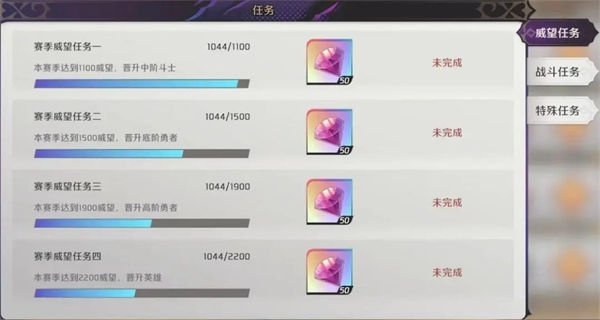 2、竞技场玩法拥有赛季任务,分别是威望任务、战斗任务和特殊任务,能解锁成就获得钻石。