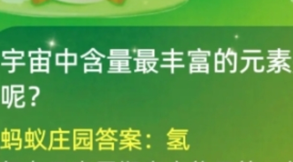 蚂蚁庄园9月30日的问题是宇宙中含量最丰富的元素是什么呢,本题答案是氢,因为根据现在理论的研究,恐龙灭绝是因为大爆炸,而大爆炸后首先产生的气体是氢。