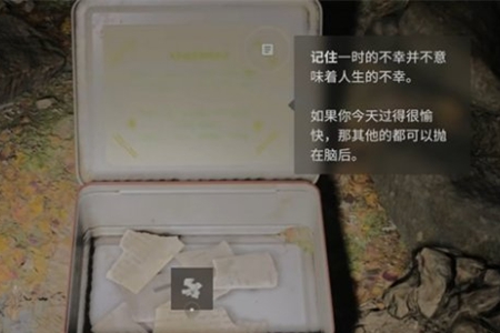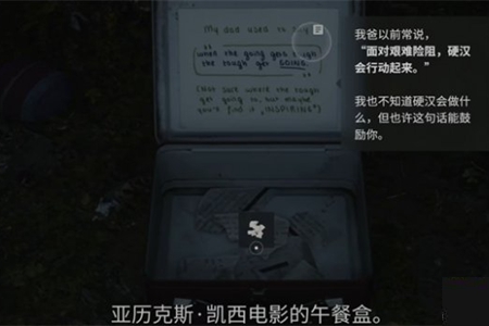 2、在灌木丛中搜寻该午餐盒可得碎片,据悉为亚历克斯·凯西个人物品,极为关键。