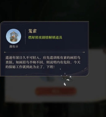 如鸢鸟笼称之为笼雀,他是完成特定剧情后解锁得到的道具,玩家可以推进剧情后得到是遗迹年深日久不可轻人,应先遣训练有素的画眉鸟探查之基本信息。