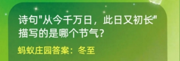 蚂蚁庄园12月22日问题是从今千万日,此日又初长描写的是哪个节气,答案是冬至,描写了冬至日的美好景象,诗人借此表达对未来的乐观态度和美好期待。