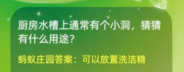 蚂蚁庄园12月26日问题是厨房水槽上通常有个小洞,猜猜有什么用途,本题答案是可以放置洗洁精,将洗洁精固定在水槽中或水槽下方,正好可以将按压头露出来。