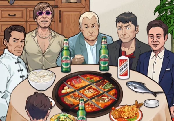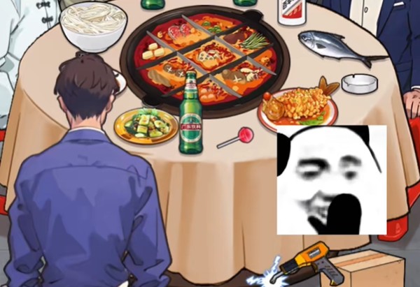 爆梗找茬王反派房间这关玩家需要服务好各位大佬才能成功通关,首先拖动两次筷子帮大佬挑出里面的葱花和牛肉,然后再拖动电焊把桌子焊住,上滑桌布打开加热的开关。