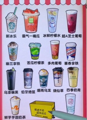 1、场景中下方的箱子会不断获得各种类型的奶茶。