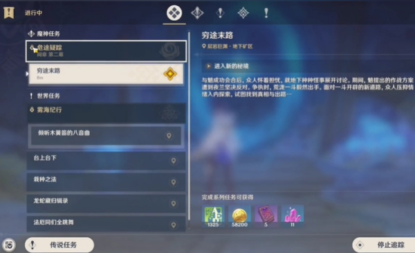 1、穷途末路属于魔神任务中的危途疑踪,位置在层岩巨渊的地下矿区。