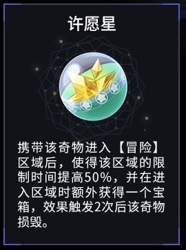 崩坏星穹铁道许愿星可以帮助玩家获得额外的宝箱,玩家携带者许愿星进入冒险区域后,该区域的限制时间可以提高50%,进入区域之后可以获得一个宝箱,效果触发两次之后许愿星就会损毁。